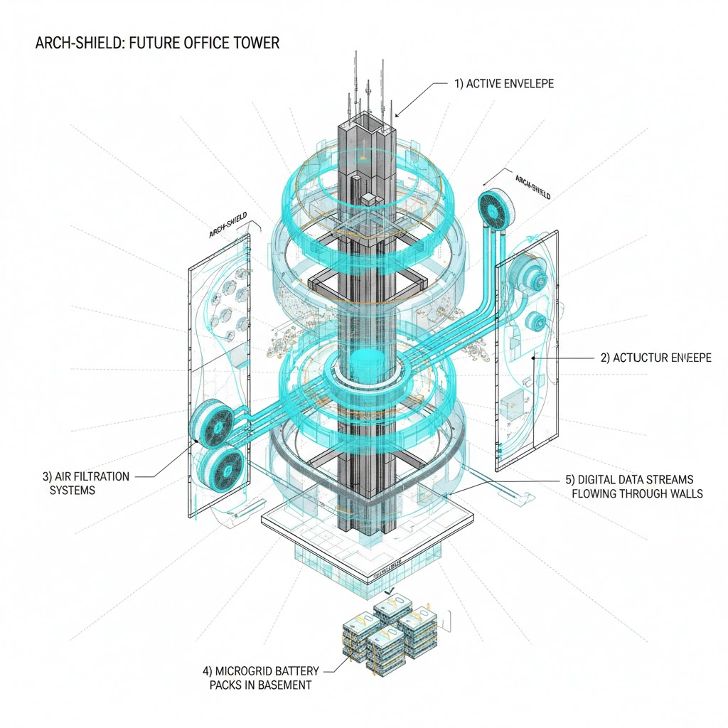 ARCH-SHIELD™ does not argue for fortress-like buildings. It argues for buildings that think like defense systems—anticipating risk, absorbing shocks, and maintaining control under pressure.